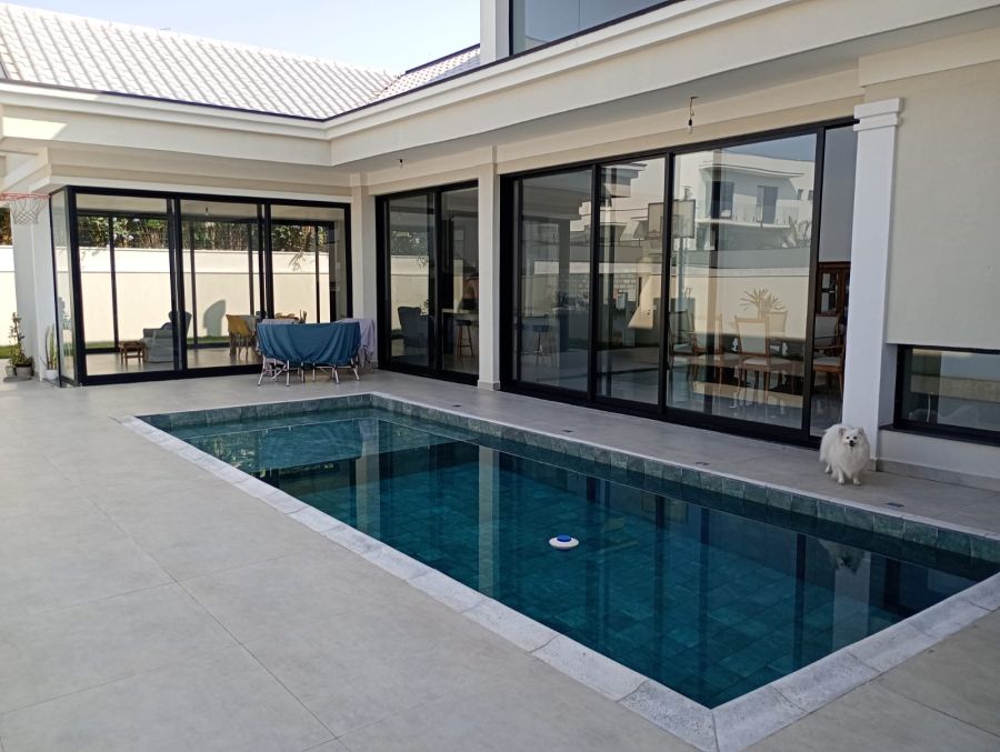 Com uma área total e privativa de 450 m², o projeto prioriza o conforto térmico e a funcionalidade. A planta é composta por 4 suítes amplas, garantindo total privacidade aos moradores. O imóvel dispõe de 3 salas distintas, que permitem a criação de ambientes de convivência integrados, além de um lavabo para atender à área social. A cozinha em estilo americano reforça a modernidade do layout, conectando-se de forma fluida aos demais espaços. Ao todo, a residência conta com 6 banheiros e garagem com capacidade para 4 veículos.